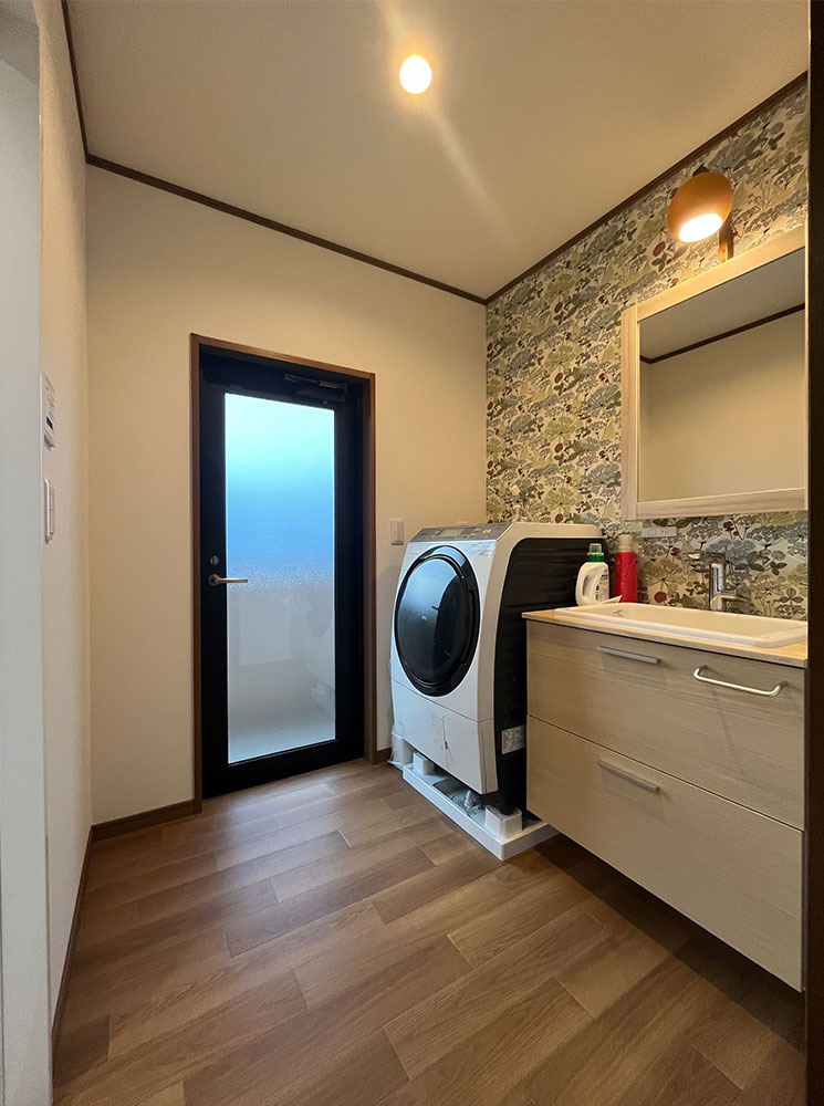 洗面化粧台を新しくし、壁紙や床も張り替えたことで、明るく清潔感のある洗面空間になりました。