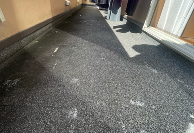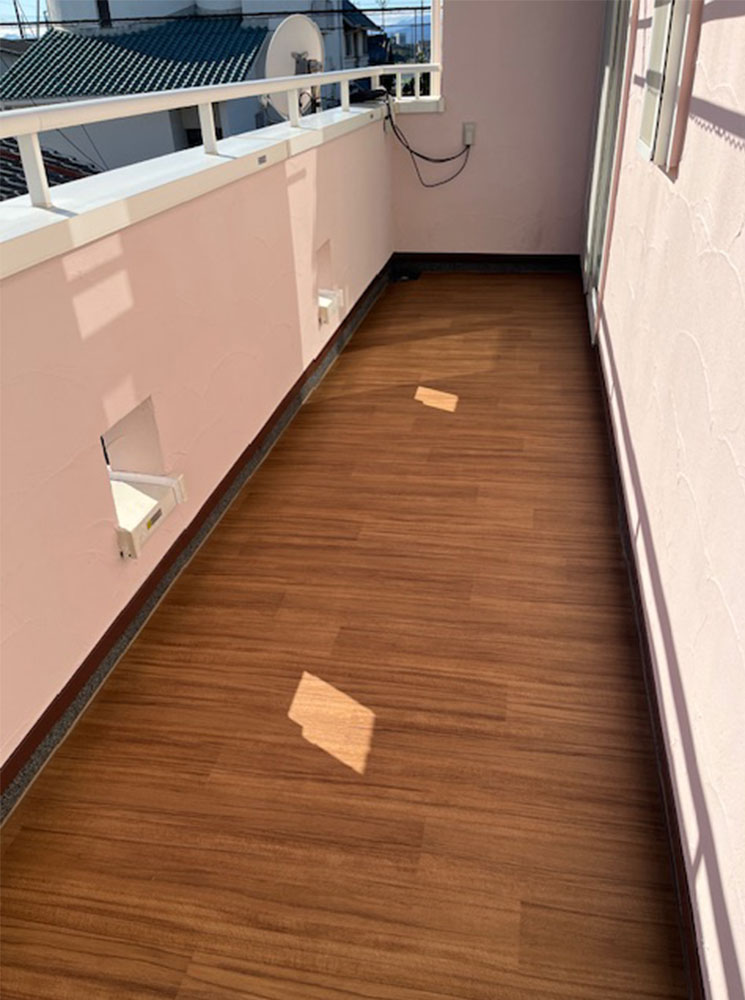 既存床材を撤去し、ランダ長尺シートを施工しました。